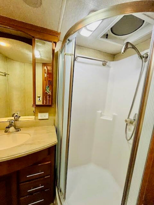 Spacious Bathroom – Large glass-enclosed shower, separate toilet room, solid surface vanity, and medicine cabinet