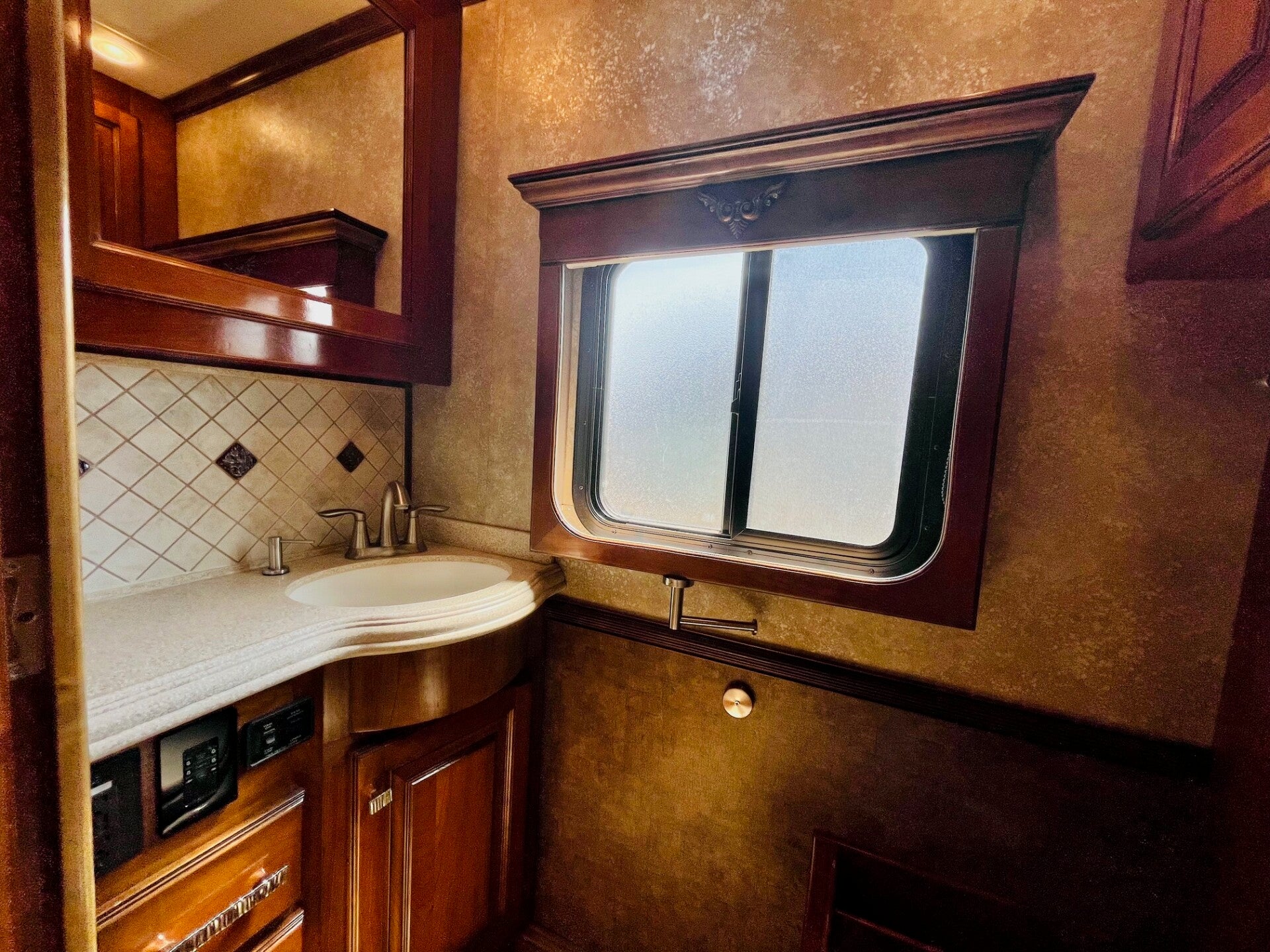 Bath: Full rear master bath with glass shower & dual vanities + mid-coach half bath