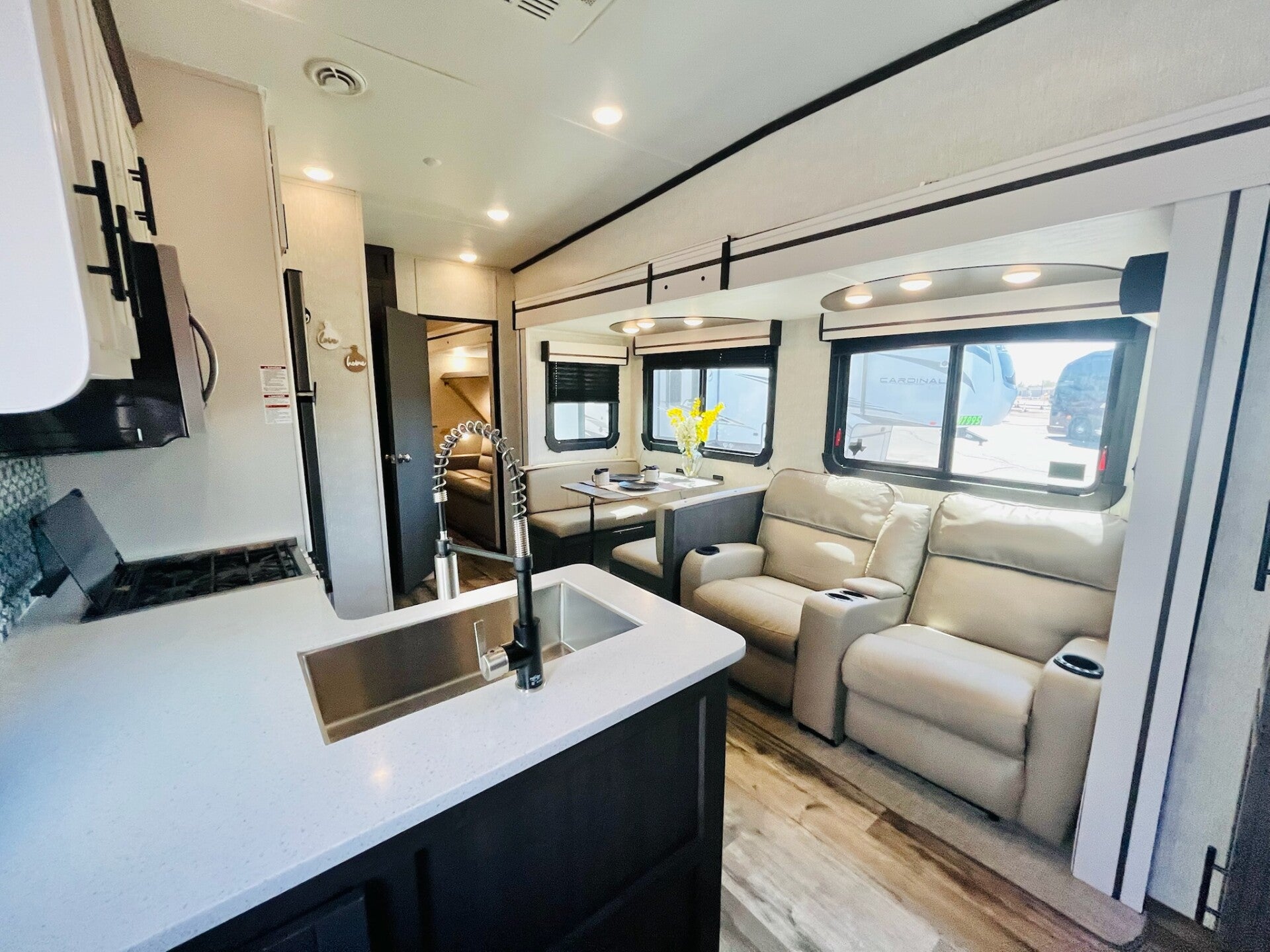 Spacious living area with theater seating & large tri-fold sofa