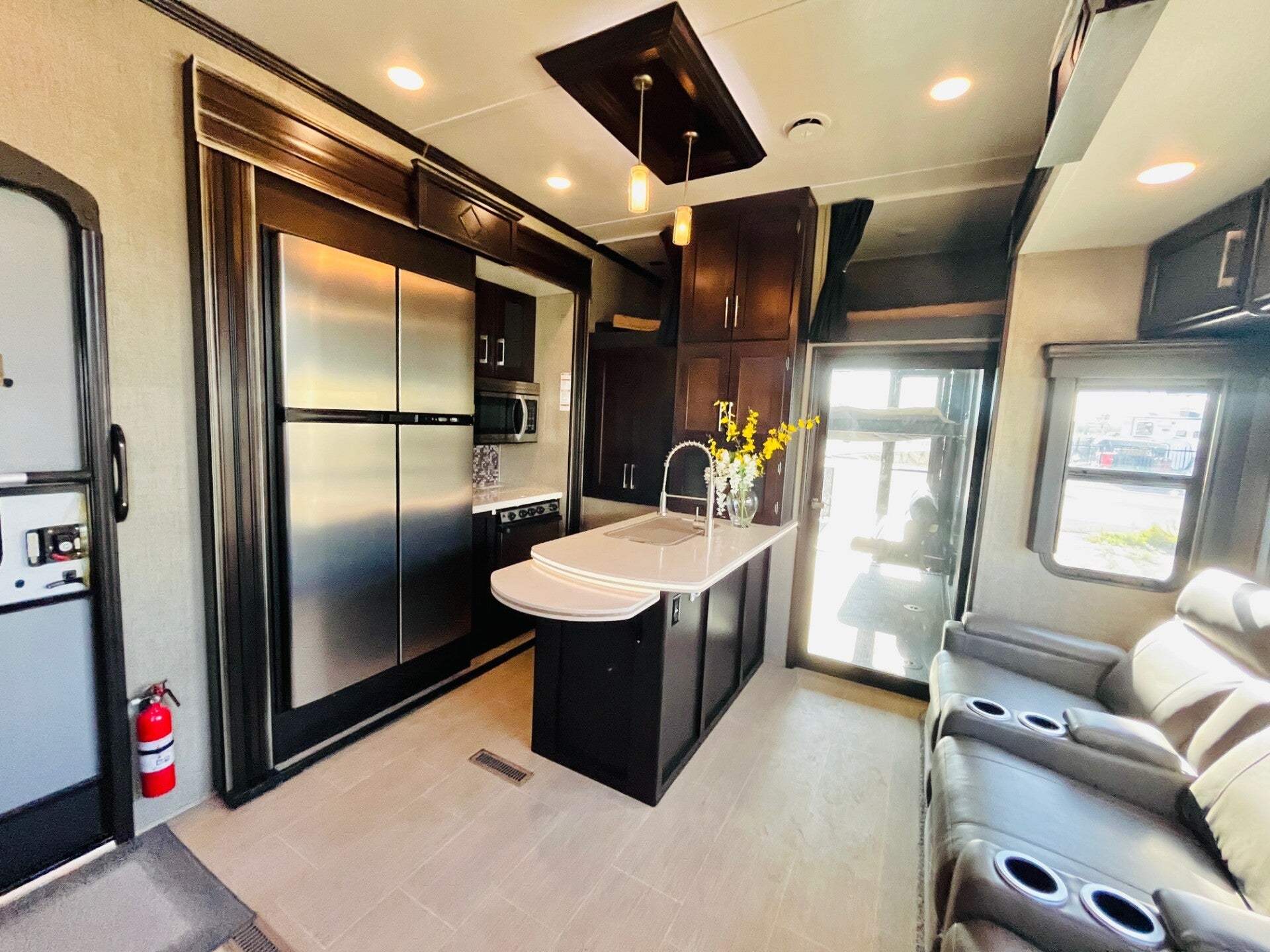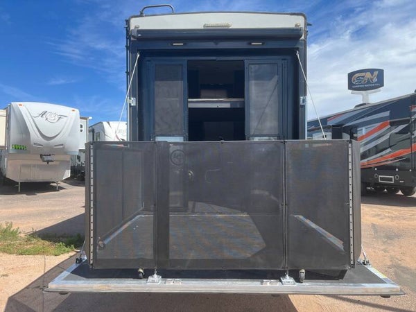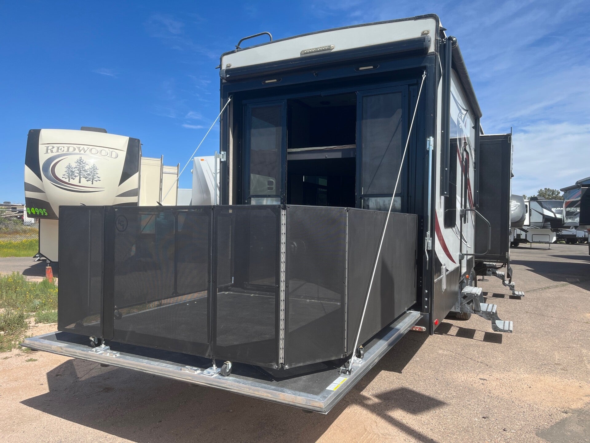 - Ramp Door: Rear motorized ramp for easy loading, Separate entry door for garage. Ramp door with patio deck system & rails.