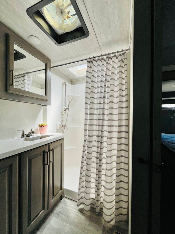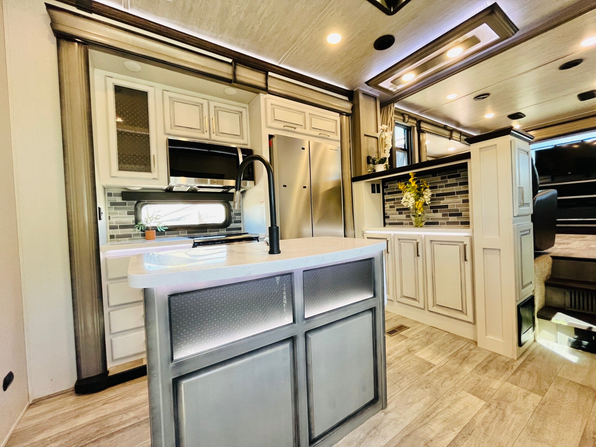 This is one of the most functional kitchens you’ll find in a fifth wheel.